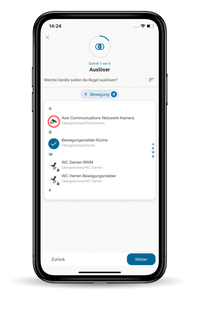 Wähle das Gerät, das die Wenn- /Dann Regel auslösen soll. Du kannst auch mehrere Geräte als Auslöser bestimmen, wenn diese die gleiche Funktion erfüllen. Zum Beispiel können ein oder mehrere Bewegungsmelder als Auslöser gewählt werden.
